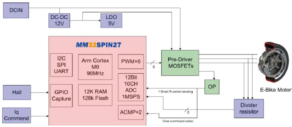 電動車 | MM32SPIN27 | ● 三模FOC高效率 ● 支持霍爾啟動與運動控制 ● 定速巡航 ● 保護功能:過流,欠壓,堵轉保護 ● 電壓:48V |
