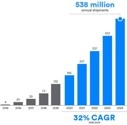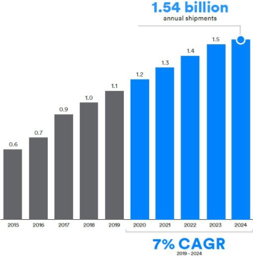 ● 音頻流應用包括:語音通話、收聽音頻/音樂、視聽設備、智能語音控制。2019-2024年增長率為7%,到2024年出貨量將達15.4億個。