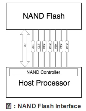 NAND FLASH需要通過專門的NFI(NAND FLASH Interface)與Host端進行通信,如下圖所示:
