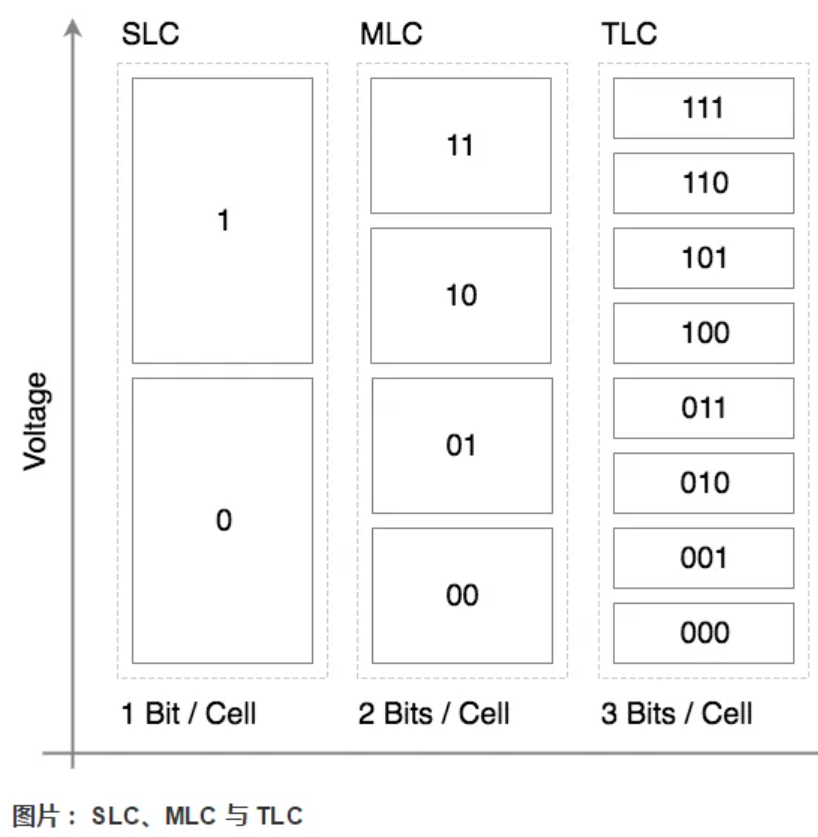 NAND FLASH的一個存儲單元內(nèi)部,是通過不同的電壓等級,來表示其所存儲的信息的。在SLC中,存儲單元的電壓被分為兩個等級,分別表示0和1兩個狀態(tài),即1個比特。在MLC中,存儲單元的電壓則被分為4個等級,分別表示00011011四個狀態(tài),即2個比特位。同理,在TLC中,存儲單元的電壓被分為8個等級,存儲3個比特信息。
