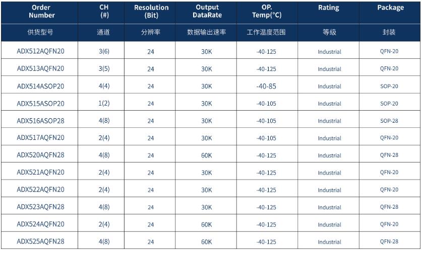 模數轉換器芯片ADX5xx系列具有超低噪聲、低溫漂、低功耗等特性,高達23位無噪聲精度和2ppm的非線性度。其內置傳感器斷路檢測電路,保證了ADC的輸入連接連續性;可選的輸入緩沖器極大地增加了輸入阻抗,并減少對外部緩沖器的需要;內置低噪聲PGA提供從1到128的增益以適應各種輸入信號;兼容SPI的串行接口僅需三根線即可運行,從而簡化了與外部控制器的連接;集成校準功能支持所有PGA增益設置的偏移和增益誤差的自校正和系統校正。