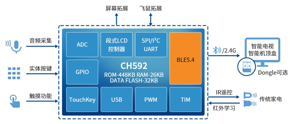 本方案基于沁恒CH592低功耗藍(lán)牙MCU,支持藍(lán)牙、2.4G和IR紅外遙控模式。遙控器可與電視機(jī)、機(jī)頂盒直連,也可通過(guò)配套的藍(lán)牙/2.4G Dongle建立連接。