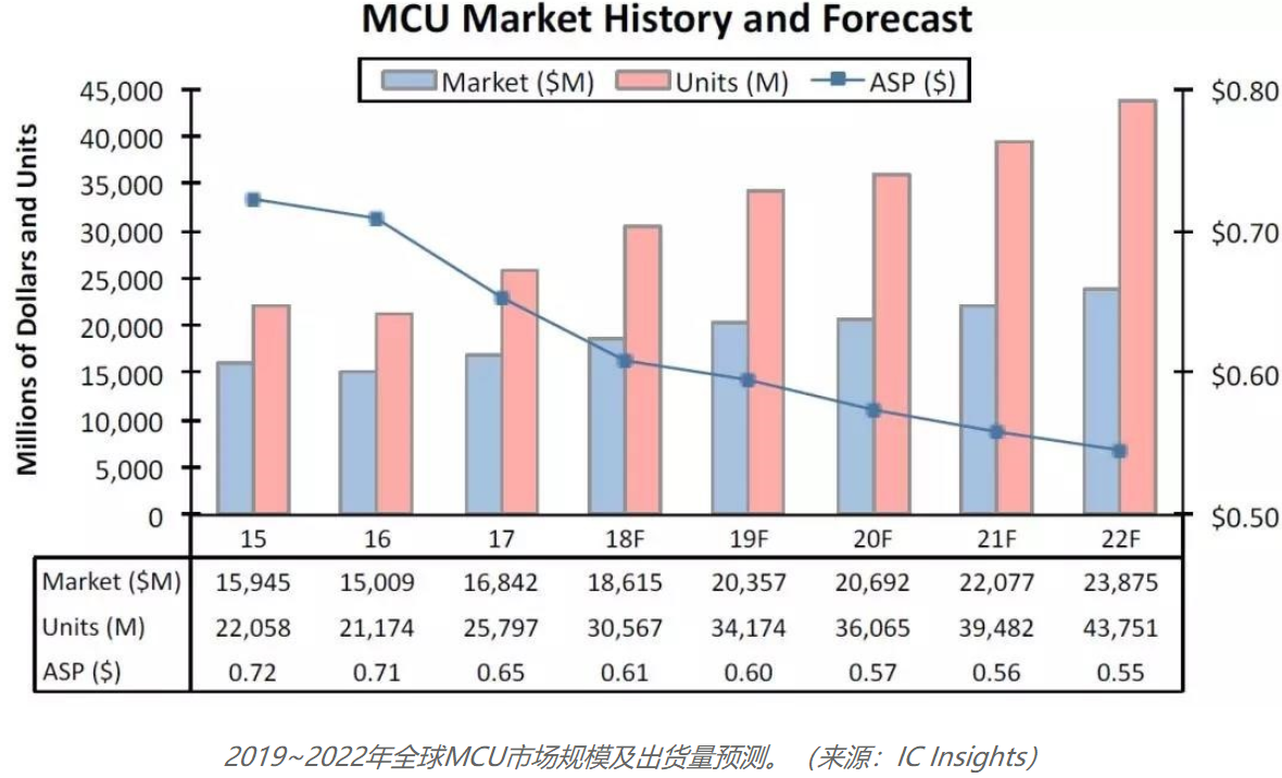 據IC Insights研究報告預測,2019年全球MCU市場規(guī)模將達204億美元、出貨量達到342億顆,不過平均售價(ASP)將持續(xù)下降。