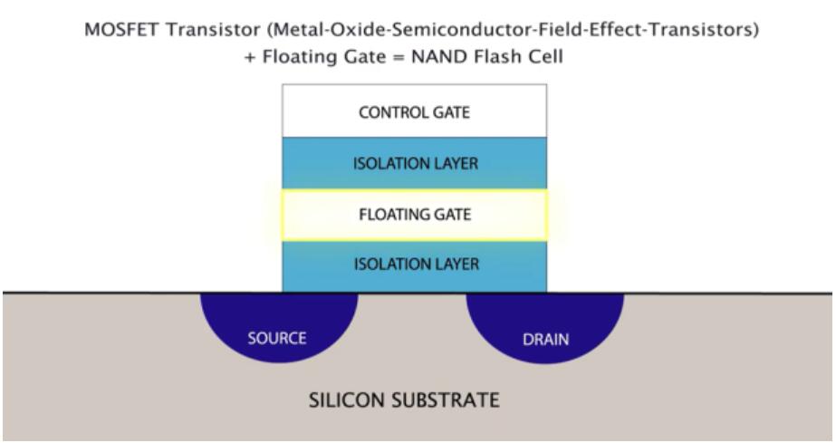 閃存單元由修改的場效應(yīng)晶體管(FET)組成,在控制柵極和通道之間的絕緣層中具有額外的“浮置”柵極。通過施加高壓將電荷注入到浮柵上(或從浮柵上去除)。這會(huì)改變打開晶體管所需的柵極電壓,該電壓代表存儲(chǔ)在單元中的值。這些單元的陣列構(gòu)成一個(gè)塊,整個(gè)存儲(chǔ)器由多個(gè)塊組成。