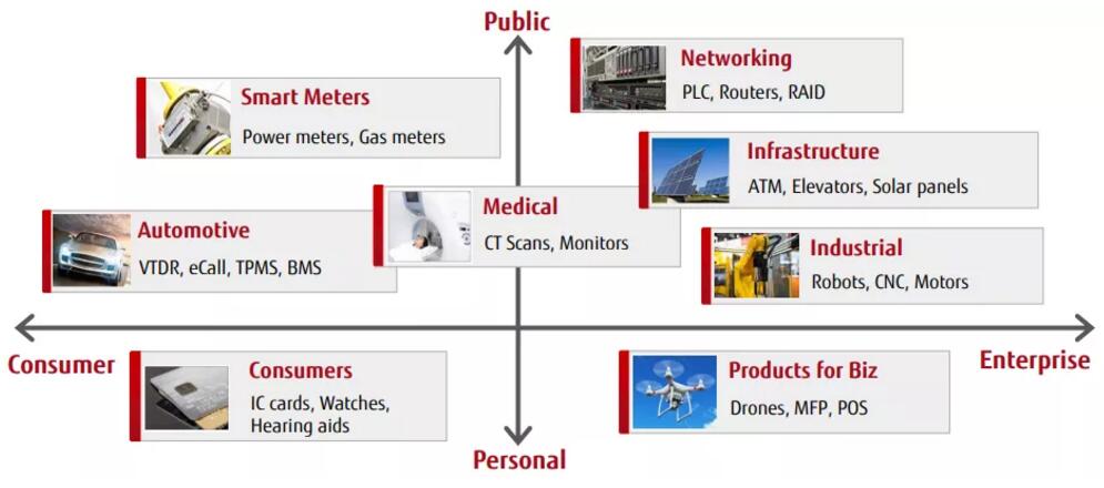 經(jīng)過市場的長期廣泛驗(yàn)證以及技術(shù)的不斷突破,富士通FRAM產(chǎn)品已成功應(yīng)用于智能卡及IC卡等卡片領(lǐng)域、電力儀表及產(chǎn)業(yè)設(shè)備等工業(yè)領(lǐng)域,醫(yī)療設(shè)備及醫(yī)療RFID標(biāo)簽等醫(yī)療領(lǐng)域、胎壓監(jiān)測(cè)及新能源汽車電池管理系統(tǒng)等汽車領(lǐng)域等等,涉及的應(yīng)用超過200種,幾乎覆蓋所有主要領(lǐng)域!