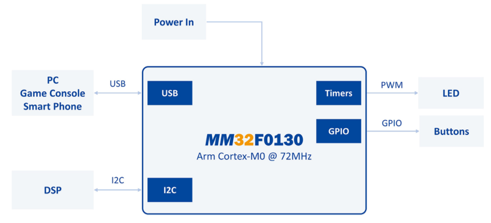 靈動(dòng)微MM32F0133C7P整合USB接口與豐富的資源,在設(shè)計(jì)外接聲卡時(shí)能與DSP做連接與溝通,此外USB界面通過USB-IF certificate,無(wú)論是在接到Host端的PC/NB,Game console與Smart Phone都可以有良好的兼容性。