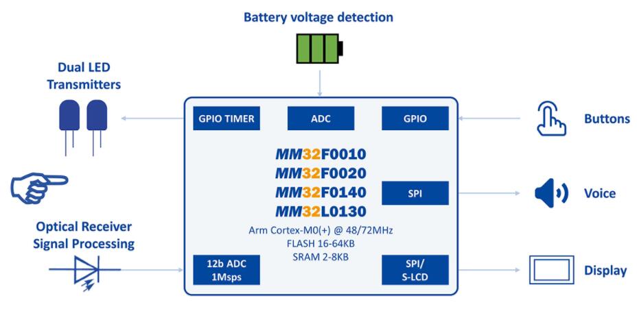 -MM32L0130集成了段碼LCD控制器,且待機(jī)功耗可低至100nA,可進(jìn)一步降低血氧儀的整體功耗,實(shí)現(xiàn)更長久和易用的用戶體驗