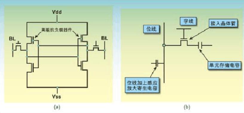 圖1a:典型的六晶體管靜態RAM存儲單元。圖1b:典型的單晶體管/單電容動態存儲器存儲單元。